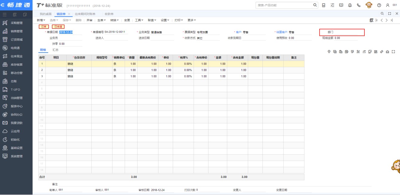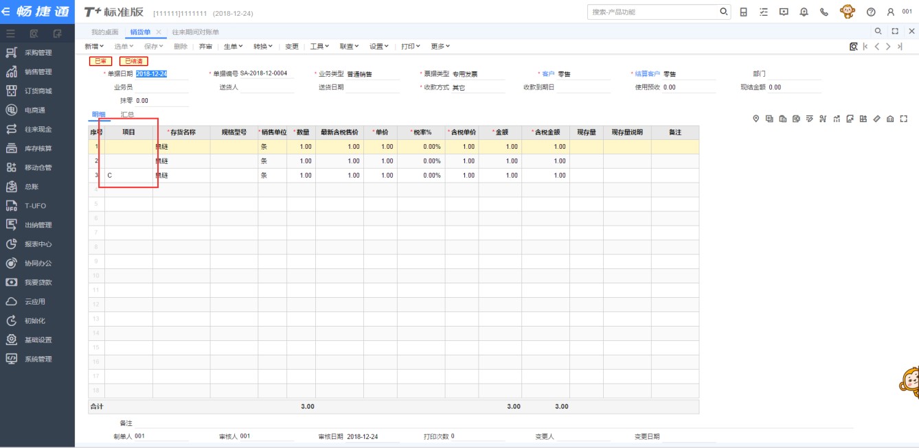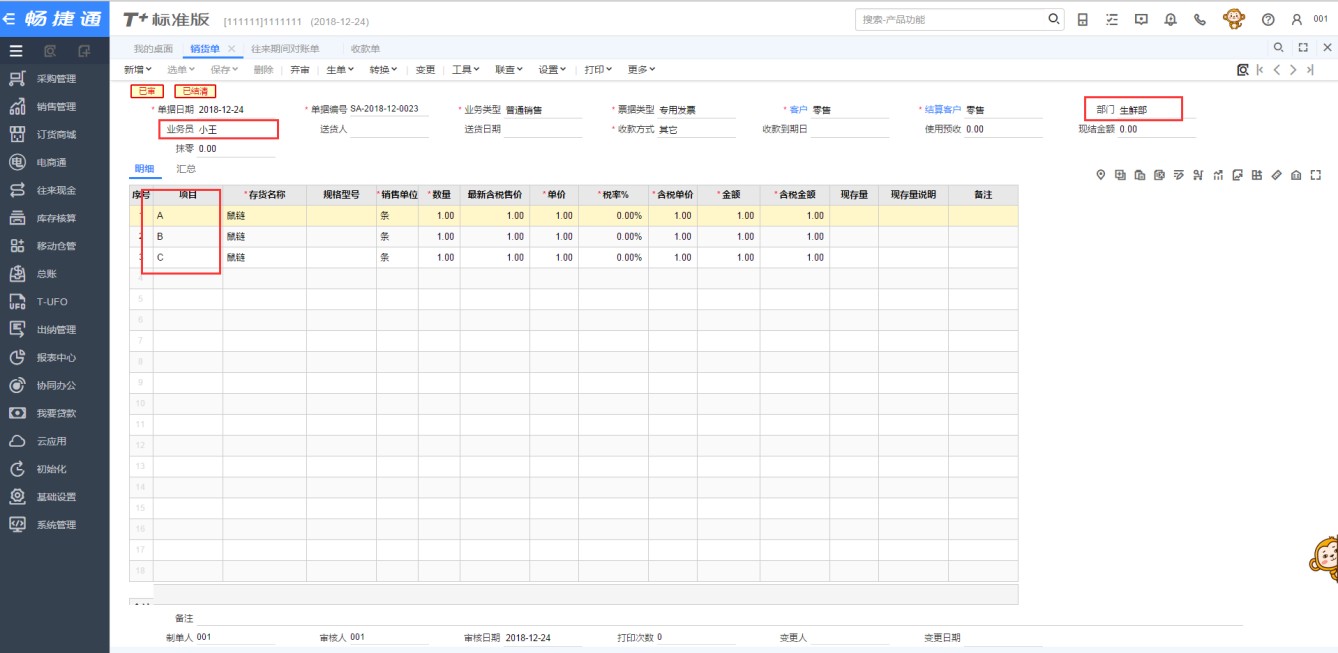 以上三种情况是销货单上的项目/部门/业务员只有一个字段有内容,其他两个字段都为空。